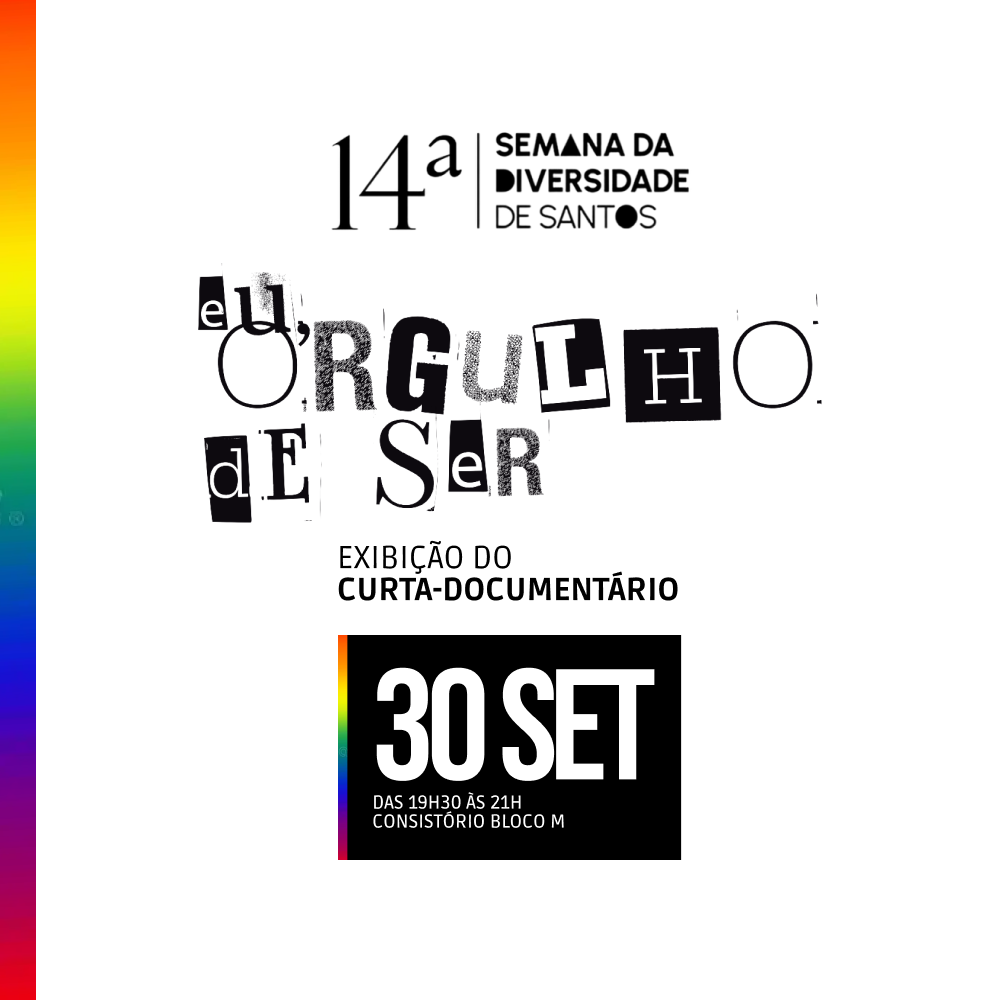 A exibição acontece no dia 30/09, às 19h30, no Consistório da Unisanta. Estudantes do quarto ano de Jornalismo da Faculdade de Artes e Comunicação da Universidade Santa Cecília (FaAC /Unisanta) apresentam, no próximo dia 30 de setembro, o curta-documentário “Eu, Orgulho de Ser”, como parte da programação da 14ª Semana da Diversidade Sexual de Santos. […]
