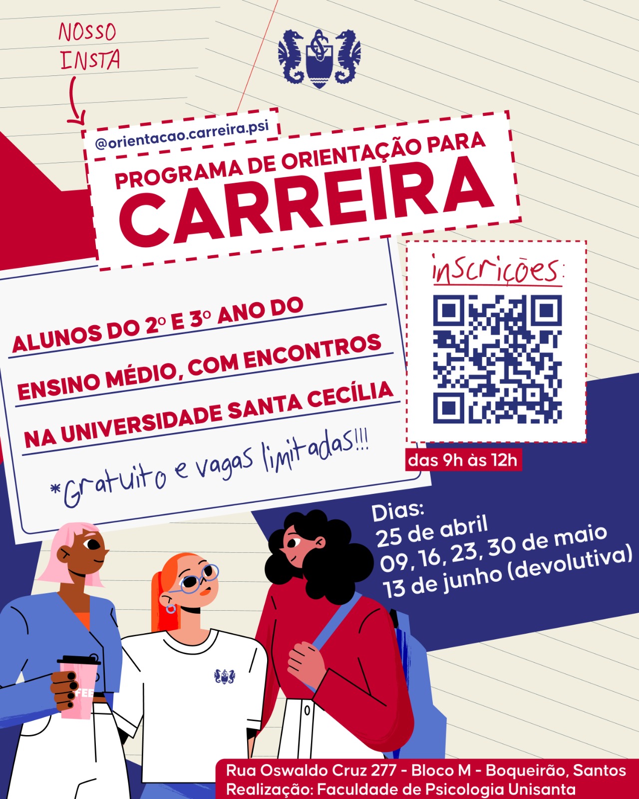 Escolher uma carreira é um dos momentos mais importantes e também mais desafiadores na vida de um estudante. Pensando nisso, o curso de Psicologia da Unisanta promove o Programa de Orientação para a Carreira, uma iniciativa gratuita voltada a alunos da 2ª e 3ª séries do Ensino Médio. O programa contará com cinco encontros presenciais, […]