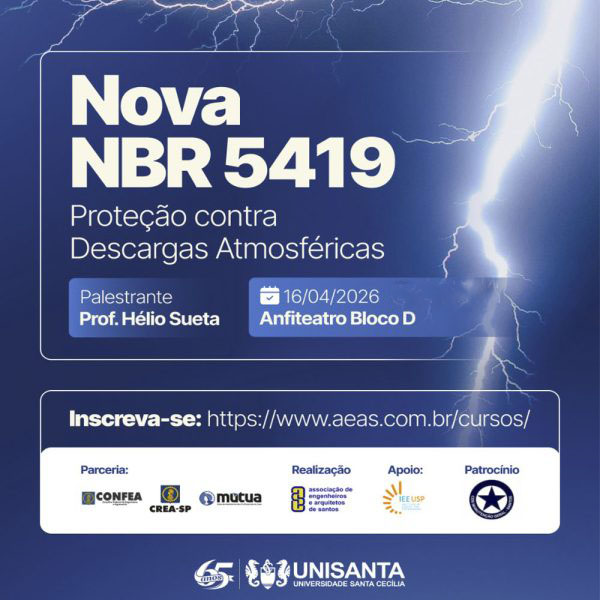 A atualização da norma brasileira NBR 5419, que trata da proteção contra descargas atmosféricas, será tema de palestra do curso de Engenharia Elétrica da Universidade Santa Cecília (Unisanta) marcada para o dia 16/4, no Anfiteatro do Bloco D, às 19h. O evento será ministrado pelo professor Hélio Sueta e é voltado a estudantes, engenheiros e […]